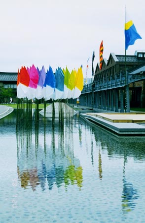 水辺には七色に染め分けたフラッグを林立させた『虹の森』、プロムナードには左右に月と日(陰と陽)のシンボルフラッグを設置し、水面に映るゆらぎと風が創り出す布の表情とはためく音。この背景の中で人が散策し、ある時は加賀能が舞われ、ある時はモンゴルの馬頭琴のコンサートが行われたり、と彩りゆたかなフラッグ展になりました。